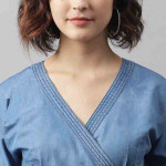 Blue solid culotte jumpsuit with waist tie-ups, has a v-neck, short sleeves, 2 pockets