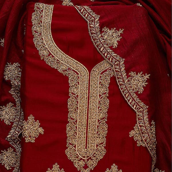 Maroon & Gold-Toned Embroidered Art Silk Unstitched Dress Material