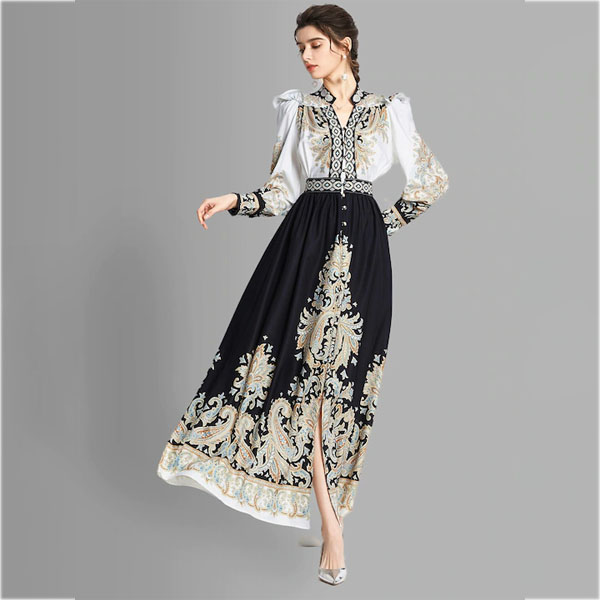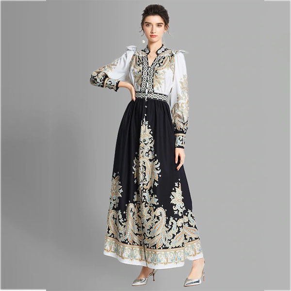 Black and white ethnic motifs print maxi dress